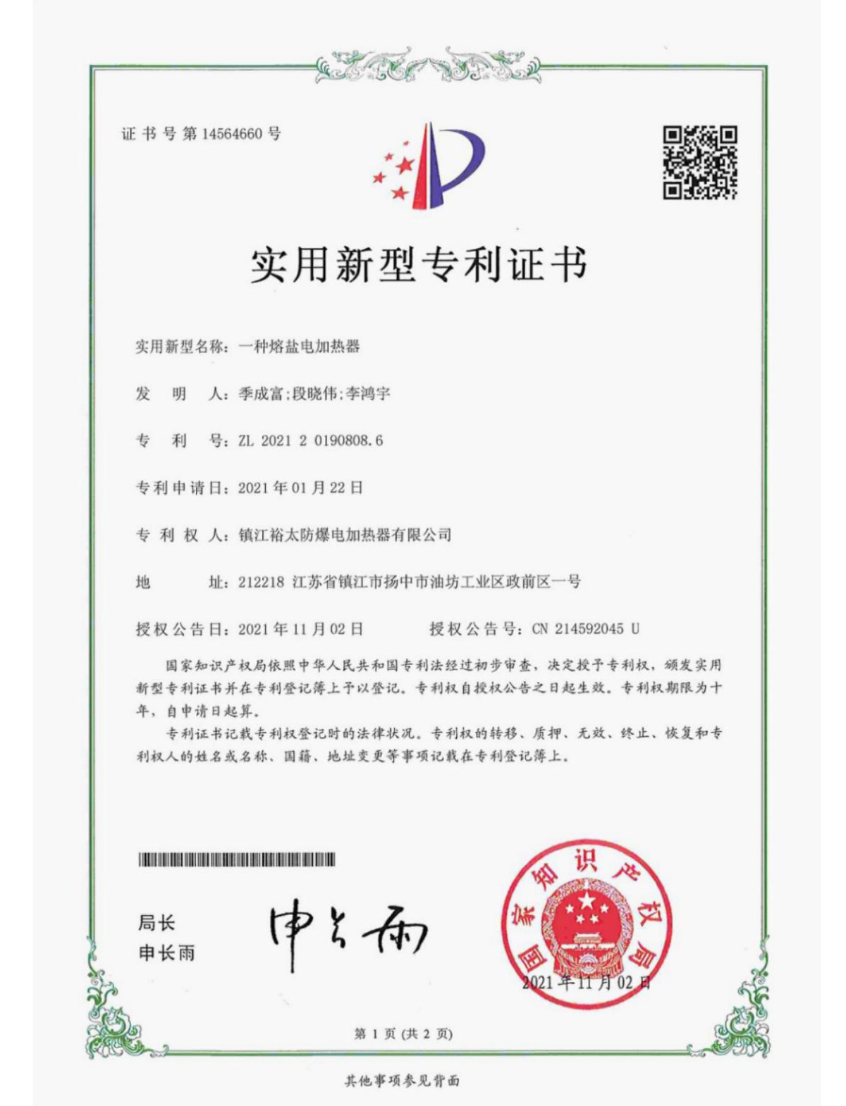 《一种熔盐电加热器》由镇江裕太防爆电加热器有限公司发布于2025年9月13日