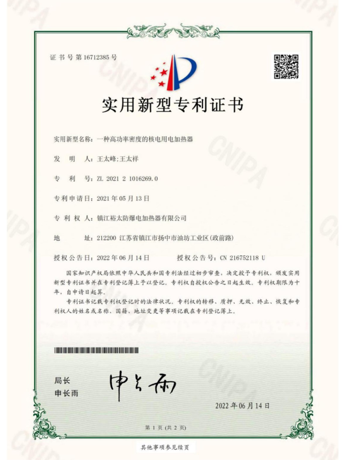 《一种高功率密度的核电用电加热器》由镇江裕太防爆电加热器有限公司发布于2022年8月29日