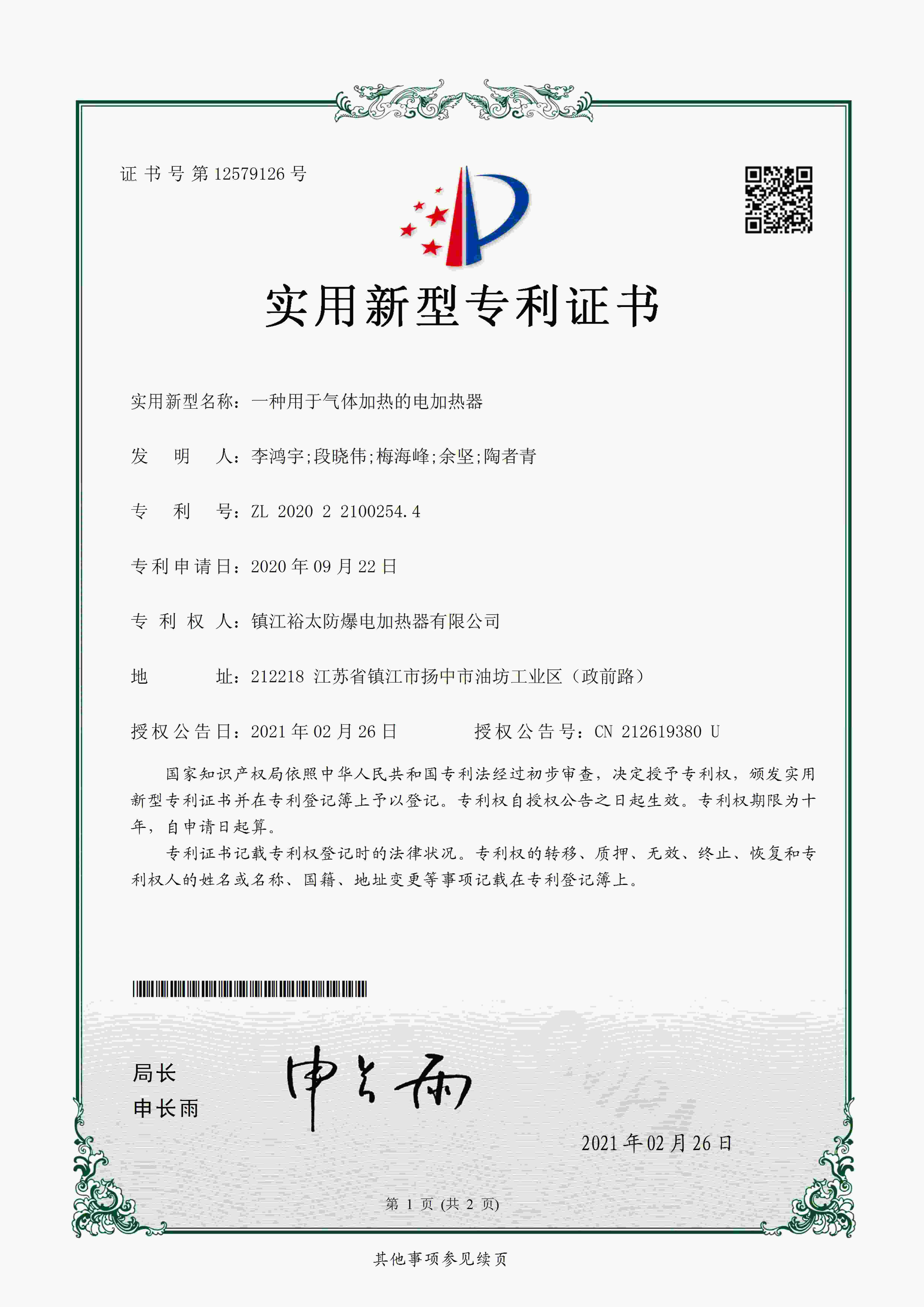 《一种用于气体加热的电加热器》由镇江裕太防爆电加热器有限公司发布于2026年4月16日