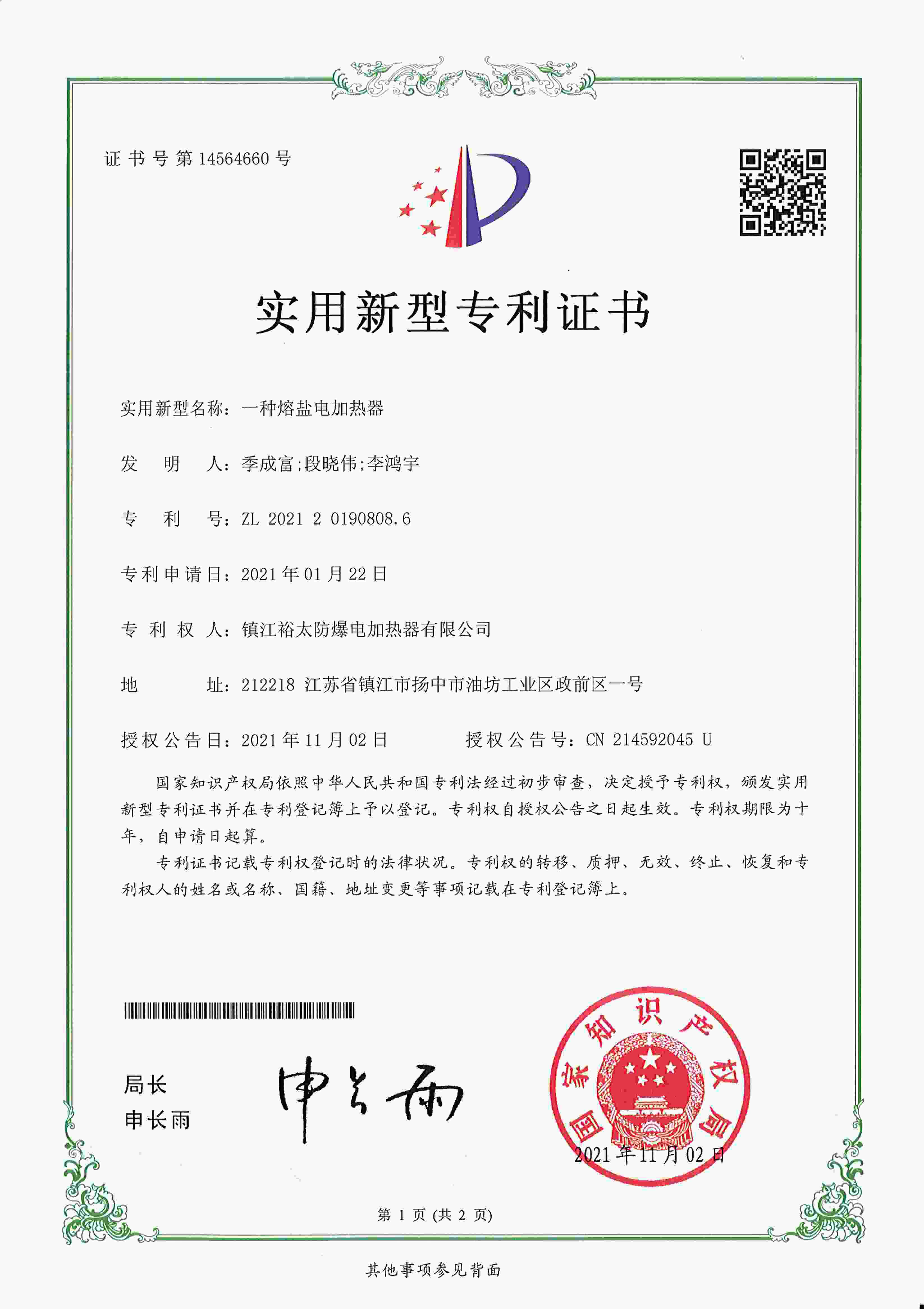 《一种熔盐电加热器》由镇江裕太防爆电加热器有限公司发布于2026年4月16日